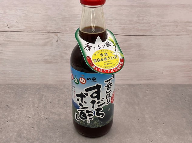 さわやかな一番搾りのすだちに、香りのゆず果汁とまろみのゆこう果汁を合わせ、鰹と昆布のだしでマイルドな味になっています。